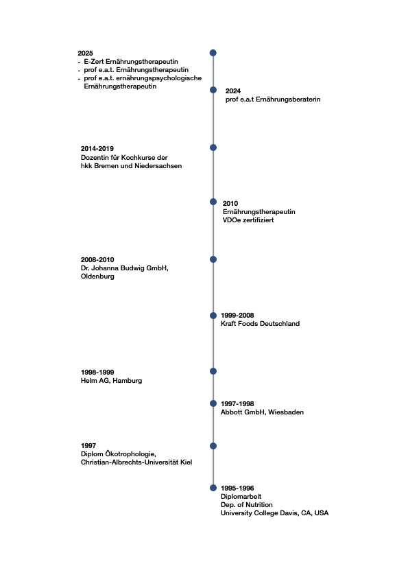 Aus dem Ruhrgebiet stammend, absolvierte ich mein Studium der Haushalts- und Ernährungswissenschaft in Kiel und machte dort, nach einem einjährigen Aufenthalt am University College Davis/USA, 1997 meinen Abschluss als Diplom-Ökotrophologin. Schon während meiner Zeit in der Nahrungsmittelindustrie waren es für mich immer die Menschen mit ihren Bedürfnissen, die mich motivierten meine Sache gut zu machen.